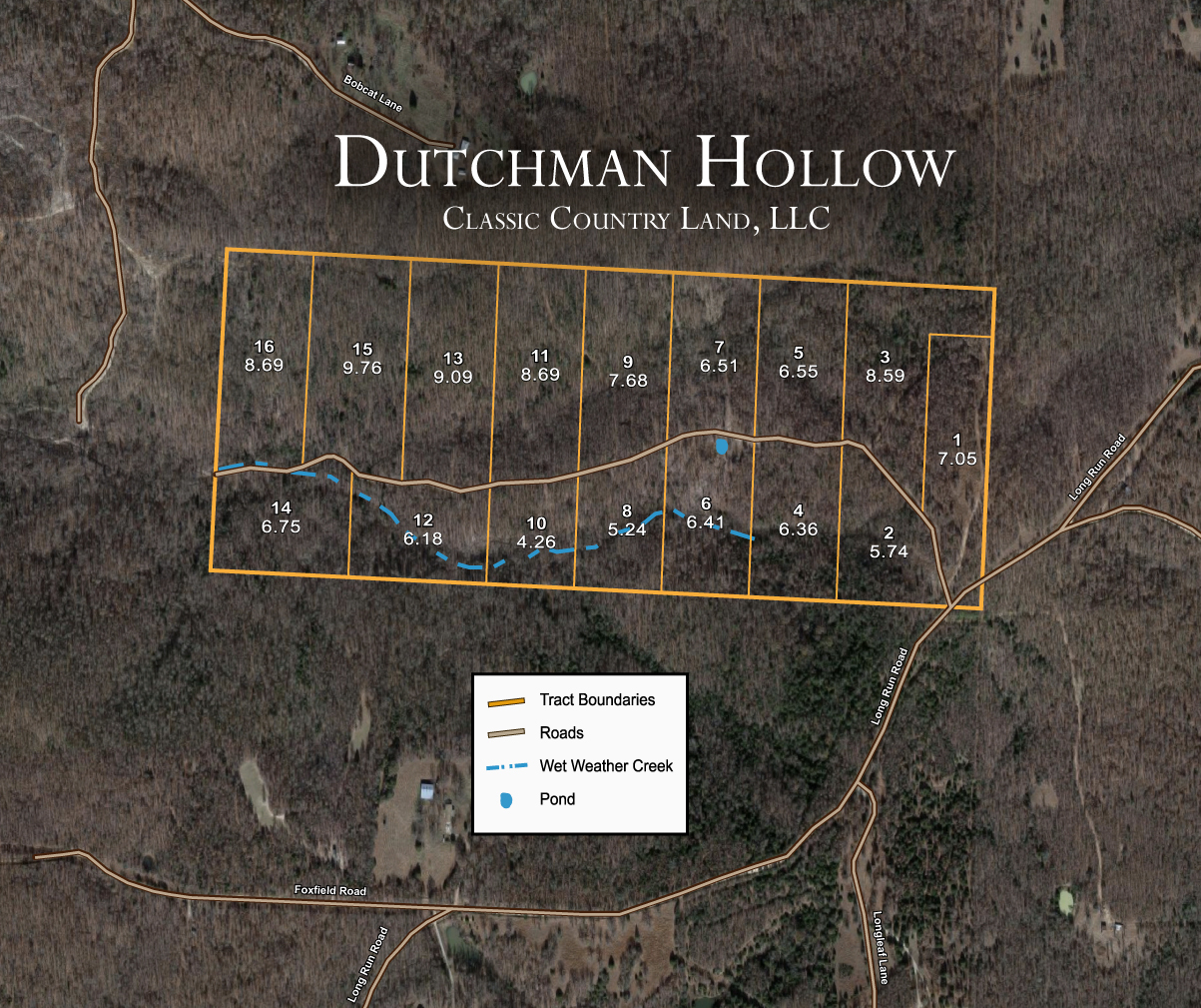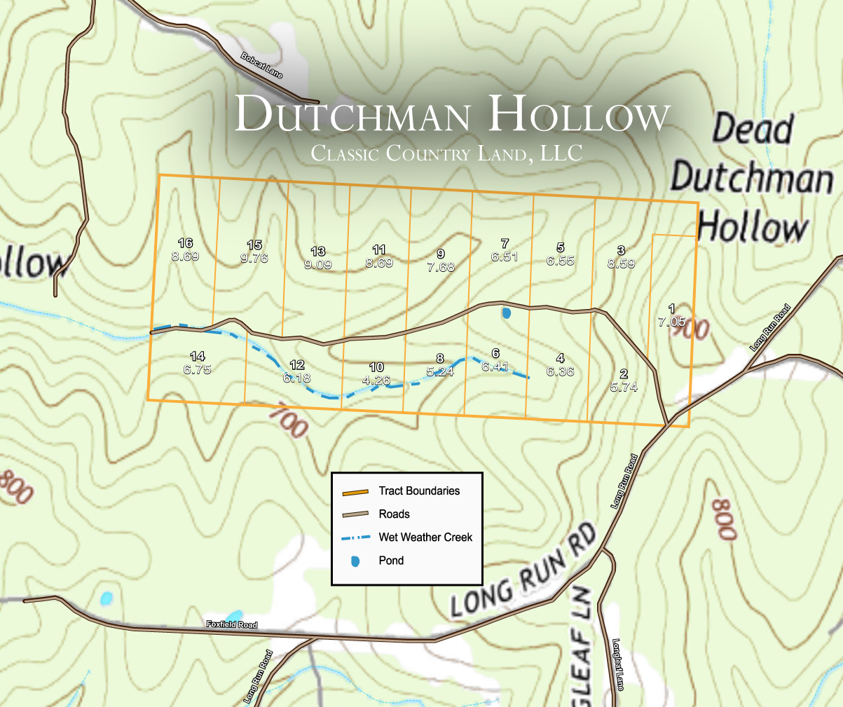 All property corners are surveyed and staked by a professional survey company. In addition, all roads are dirt road construction including recorded easements which provide you permanent, legal access to your property. Download the Dutchman Hollow Survey and Dutchman Hollow Coordinates.