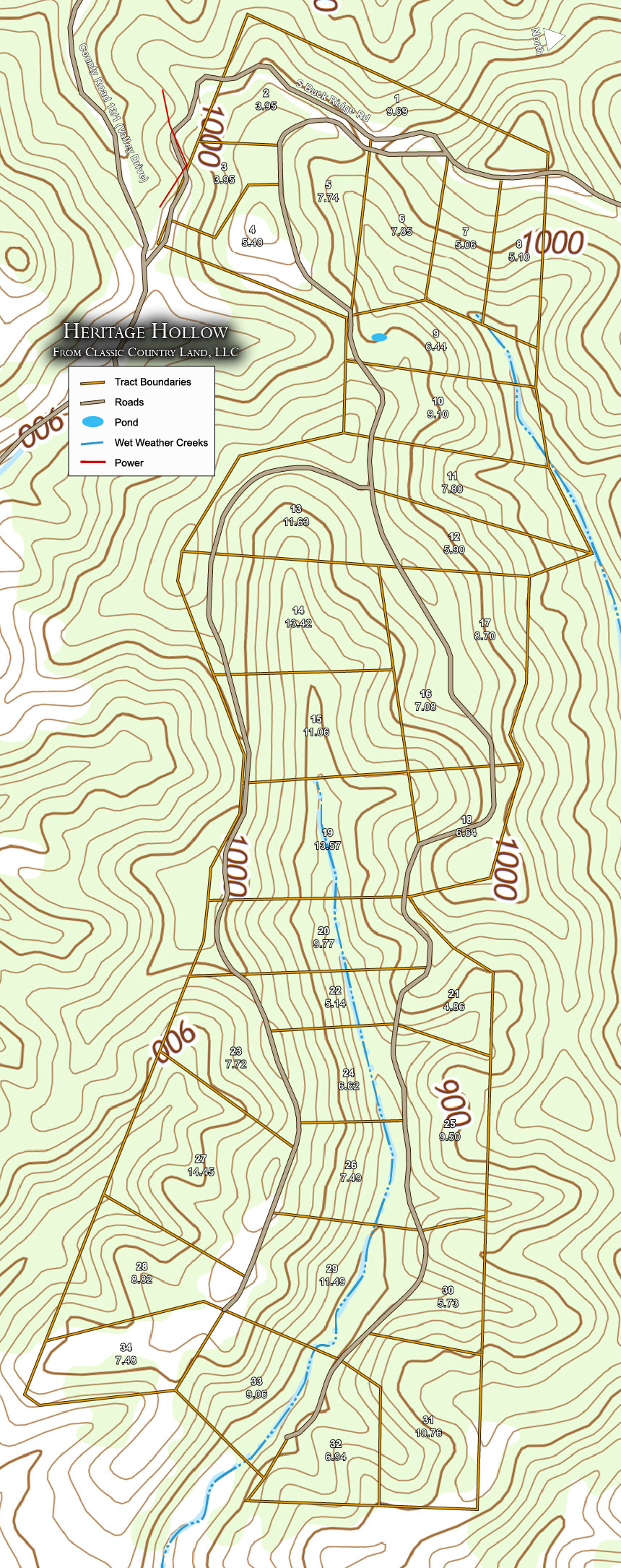 All property corners are surveyed and staked by a professional survey company. In addition, all roads are dirt road construction including recorded easements which provide you permanent, legal access to your property. Download: Heritage Hollow Survey and Heritage Hollow Coordinates.